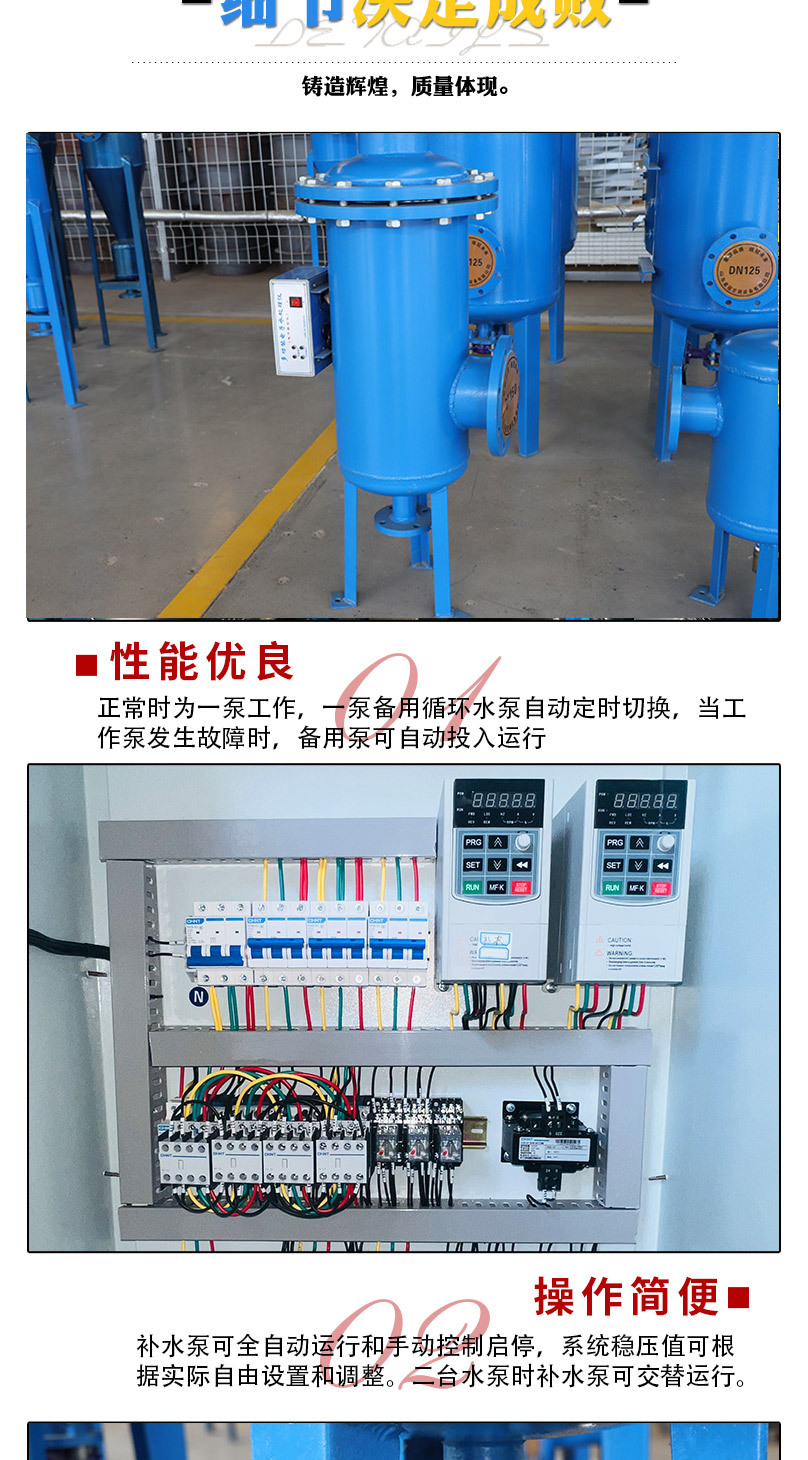 “物化法全程水處理器”打破了水處理技術(shù)的常規(guī)理念,采用物理方法、化學(xué)方法相結(jié)合的綜合處理工藝技術(shù),以物理應(yīng)運(yùn)處理為主,根據(jù)系統(tǒng)要求、補(bǔ)水水質(zhì)、環(huán)境、溫度等技術(shù)參數(shù),輔助以不同的化學(xué)方式,有效地控制、調(diào)節(jié)水質(zhì),可為使用單位節(jié)約大量藥劑,減少運(yùn)行管理費(fèi)用,結(jié)合物理法和化學(xué)法處理的優(yōu)勢,總體運(yùn)行費(fèi)用是單一傳統(tǒng)加藥方法的五分之一,從根本上解決了因水質(zhì)情況復(fù)雜而單一物理法設(shè)備或單一化學(xué)法設(shè)備解決不了的問題。
