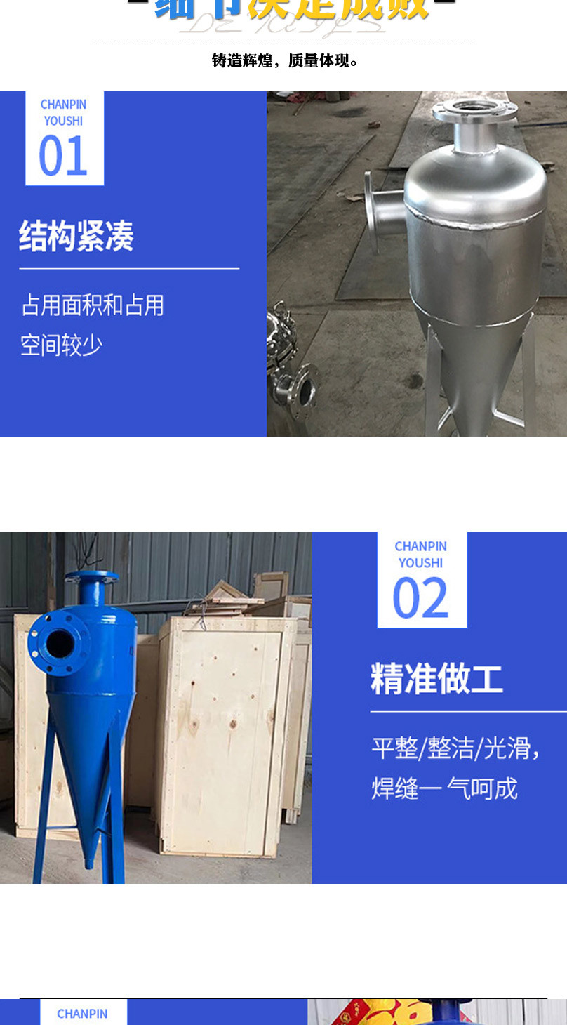 旋流除砂器是根據(jù)流體中的固體顆粒在除砂器里旋轉(zhuǎn)時的篩分原理制成,集旋流與過濾為一體,在水處理領(lǐng)域?qū)崿F(xiàn)除砂、降濁、固液分離等效果顯著。廣泛應(yīng)用于水源熱泵、水處理、食品、醫(yī)藥等工業(yè)部門。河水、井水除砂,洗煤水、工業(yè)選礦、液體除氣以及非互溶液體的分離。
